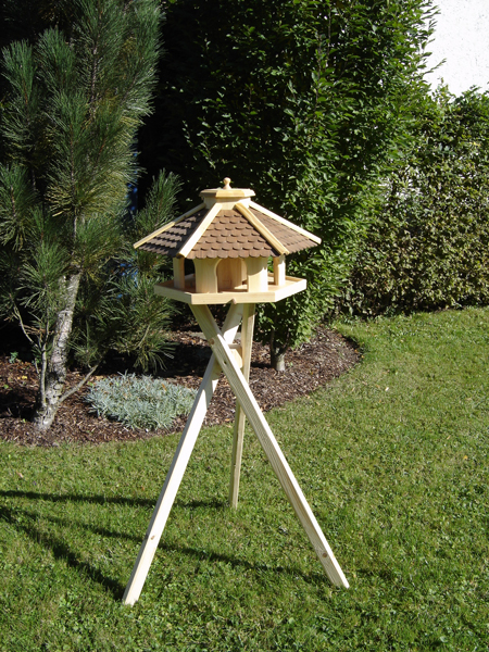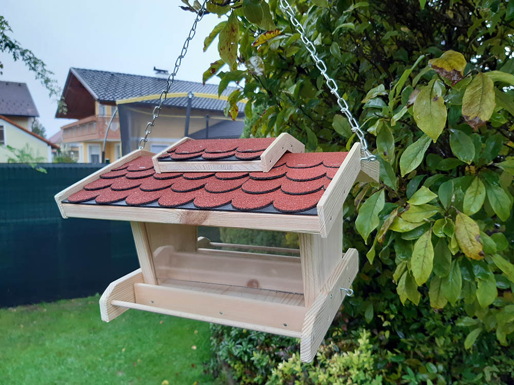 Wunderschöne massive stabile handgefertigte Vogelfutterhaus mit Silo. Das Haus ist geschraubt, Auffüllung vom Futter am Dach (siehe Foto), Futtermenge ca. 1 Kilogramm. Seitenwände mit 3 mm Acrylglas ausgeführt, Dach mit Bitumenschindel gedeckt, grünes Dach, sehr witterungsbeständig. Zum Aufhängen mit Kette, auf einen Pflock befestigen oder nur hinstellen.