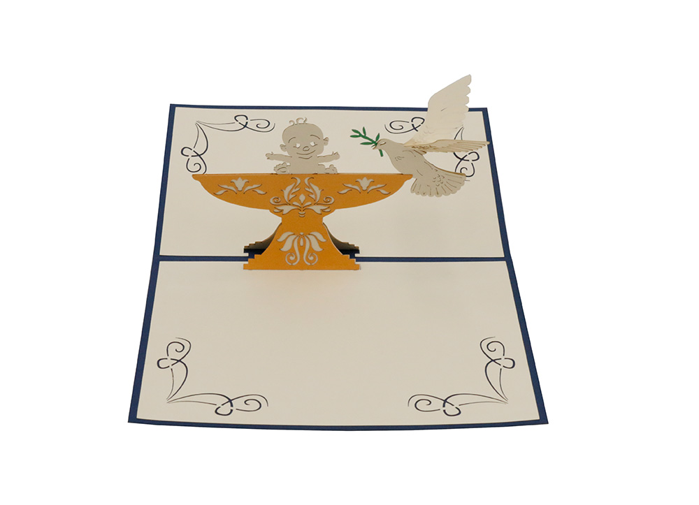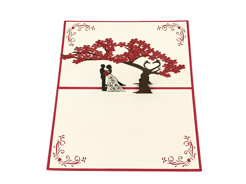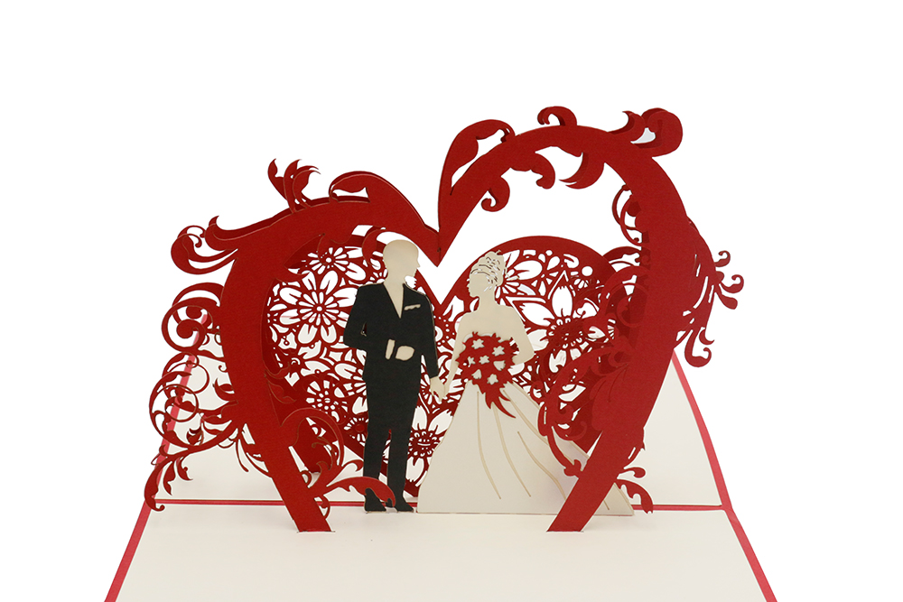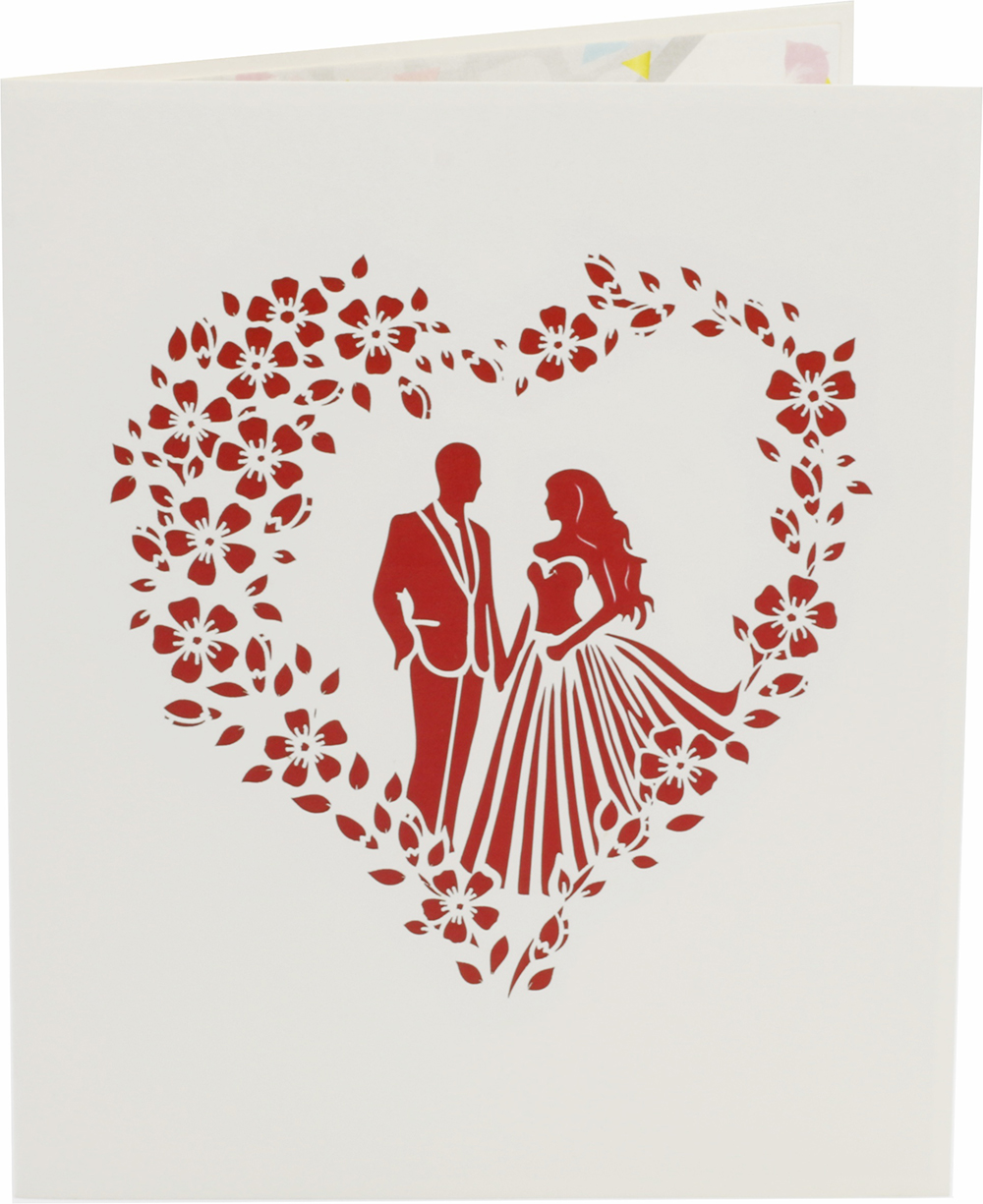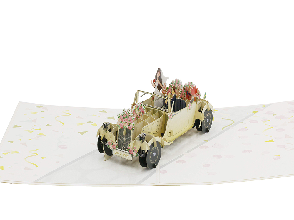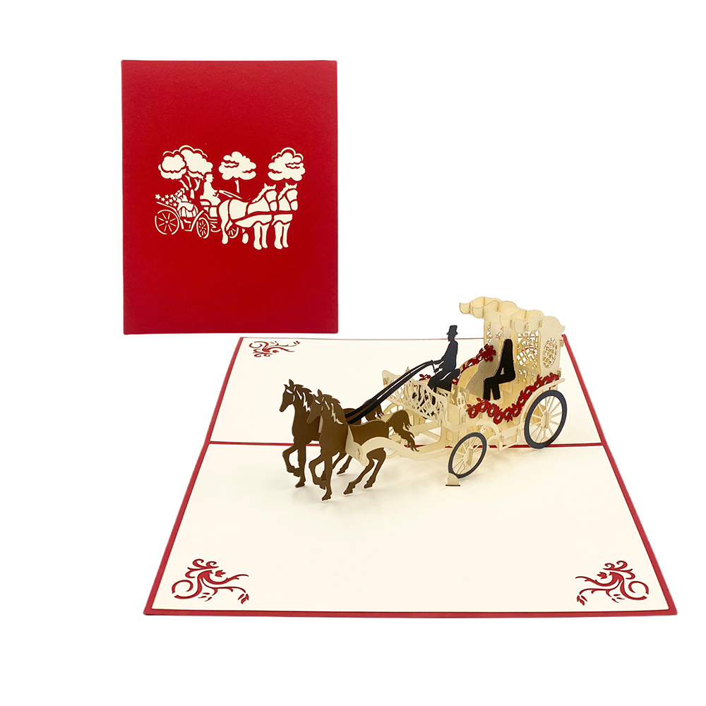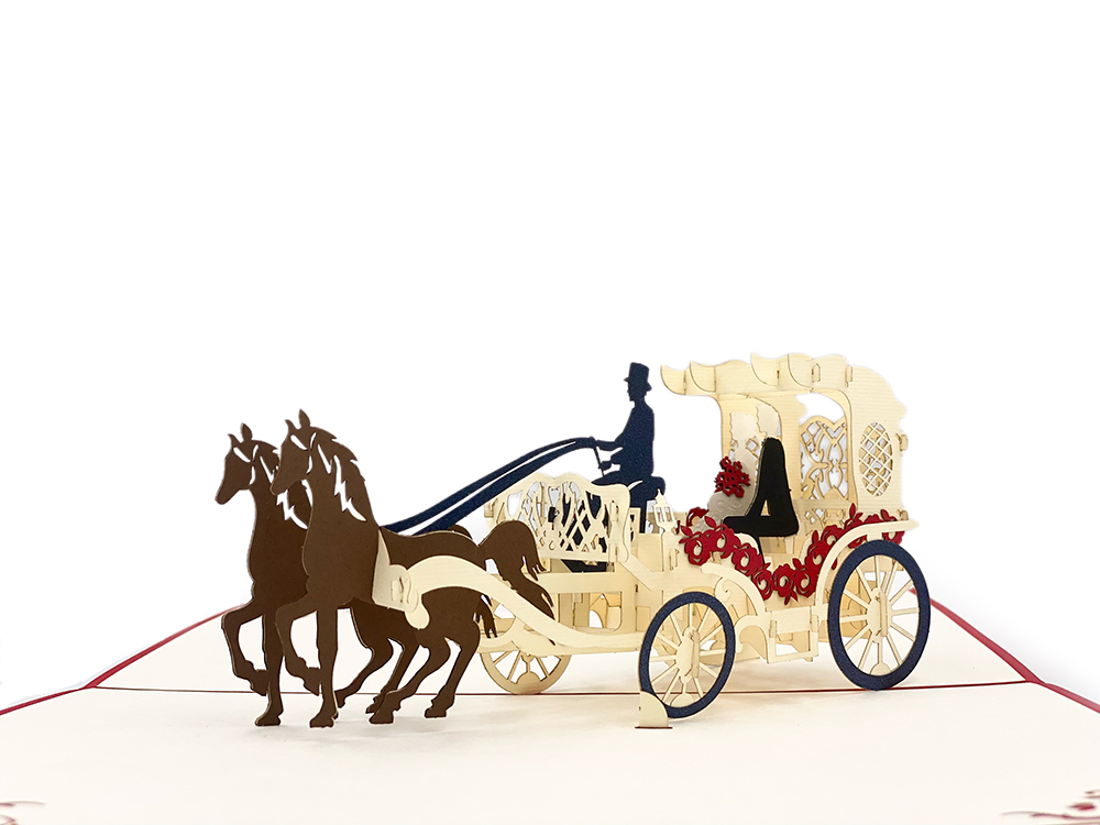 Beim Aufklappen dieser 3D Karte verzaubert Sie ein filigran gearbeitetes Hochzeitspaar, welches standesgemäß in einer Kutsche gefahren wird.