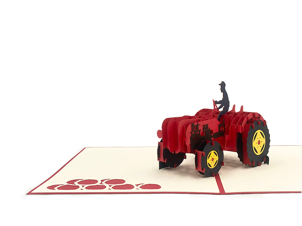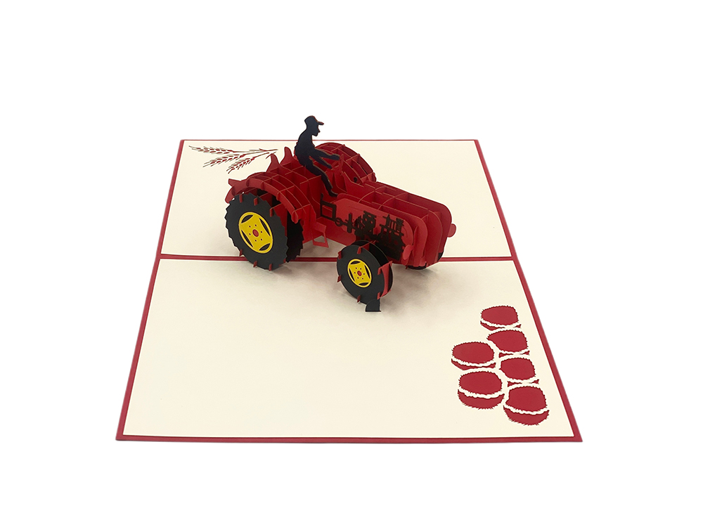 Beim Aufklappen dieser 3D Karte verzaubert Sie ein filigran gearbeiteter Traktor, der wie sein Original Eindruck hinterlässt.