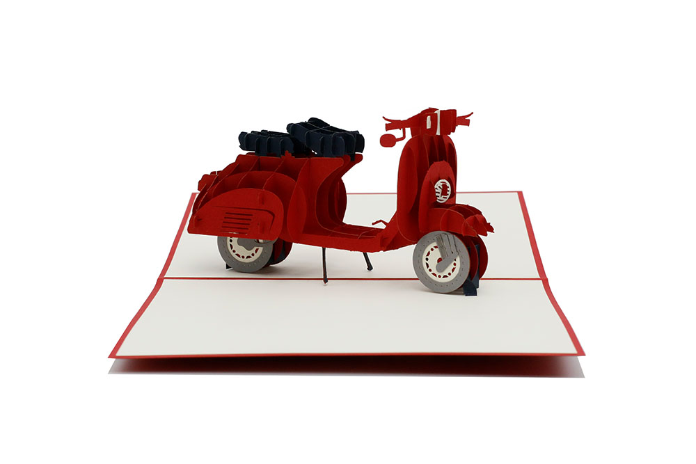 Beim Aufklappen dieser 3D Karte verzaubert Sie eine filigran gearbeitete Vespa, ein echter Klassiker.