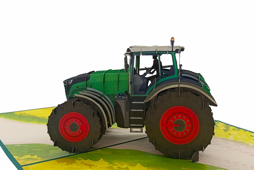 Unsere Pop-Up Karte mit Traktor ist das perfekte Geschenk für alle, bei denen bei Landmaschinen das Herz schneller schlägt. Beim Aufklappen entfaltet sich ein moderner, detailverliebter 3D-Traktor, der kraftvoll unterwegs ist.