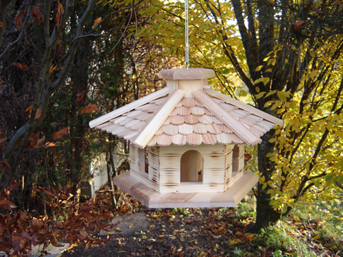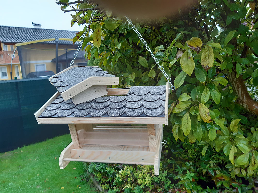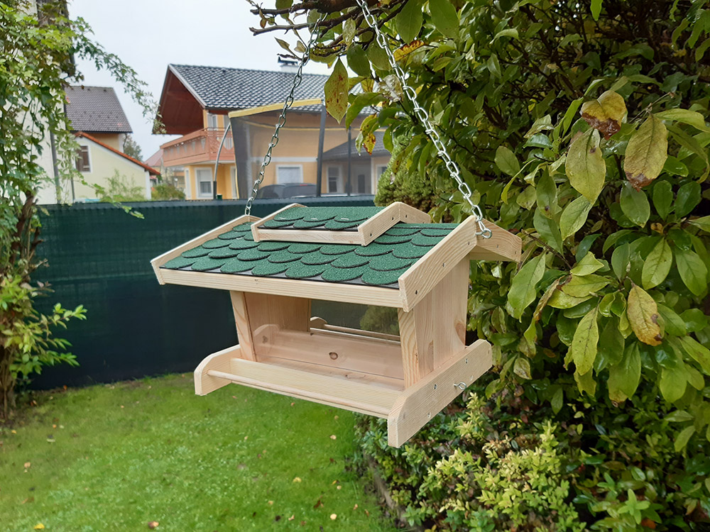 Wunderschöne massive stabile handgefertigte Vogelfutterhaus mit Silo. Das Haus ist geschraubt, Auffüllung vom Futter am Dach (siehe Foto), Futtermenge ca. 1 Kilogramm. Seitenwände mit 3 mm Acrylglas ausgeführt, Dach mit Bitumenschindel gedeckt, grünes Dach, sehr witterungsbeständig. Zum Aufhängen mit Kette, auf einen Pflock befestigen oder nur hinstellen.