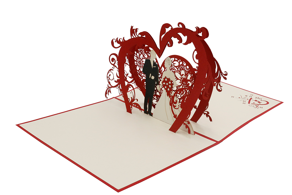 Beim Aufklappen dieser 3D Karte verzaubert Sie ein filigran gearbeitetes Hochzeitspaar, welches standesgemäß in einer Kutsche gefahren wird.
